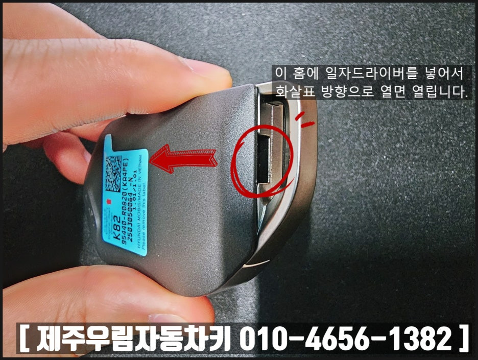 02. 홈에 일자 드라이버를 끼우고 덮개방향으로 지렛대처럼 들면 스마트키가 분리된다.